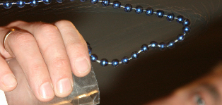 3. یک رشته بلند از ساچمه، با کشیدن قسمت به اندازه کافی بلندی از زنجیره، روی لبه بشر، از آن رها می شود. به خاطر جاذبه، سرعت رشته افزایش پیدا می کند. در لحظه ای خاص، رشته دیگر با لبه بشر تماس ندارد (عکس را ببینید). این پدیده را بررسی کرده و توضیح دهید.