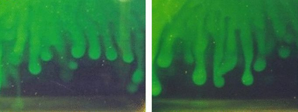 When a container with a layer of sugar water placed above a layer of salt water is illuminated, a distinctive fingering pattern may be seen in the projected shadow. Investigate the phenomenon and its dependence on the relevant parameters.